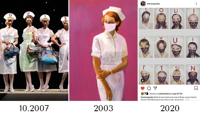 Показ Louis Vuitton сезона весна-лето 2008👆открывали 12 «медсестер» в белых халатах, характерных головных уборах (с одной из букв названия марки, поэтому и медсестер 12). У медсестер были кружевные маски (узор на кружеве был составлен из LV-монограмм) и, конечно, сумки бренда. Эти медички – реверанс в сторону творчества художника Ричарда Принса. У него была целая серия работ с общим названием Nurse👇