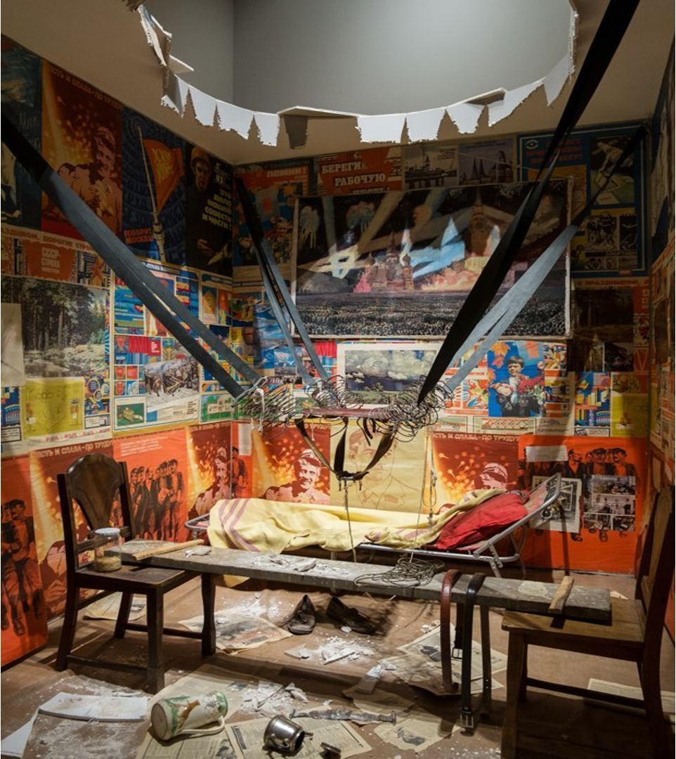 Именно в этой мастерской Кабаков сконструировал одну из своих первых, а теперь и одну из самых известных инсталляций, названную «Человек, улетевший в космос из своей комнаты» (см. фото). На первый взгляд, это обычная комната, которую можно было легко встретить в любой коммунальной квартире: у стенки стоит кровать, стены обклеены советскими плакатами. Лишь странное устройство над кроватью и дыра в потолке несколько изменяют привычное пространство и вносят какой-то хаос.