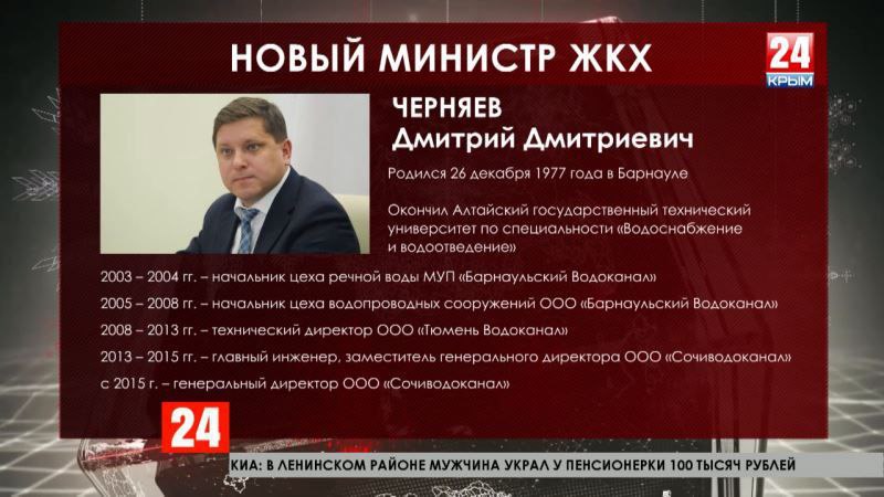 Дмитрия Черняева из ООО "Сочиводоканал" назначили министром ЖКХ Крыма. Бывшее место работы Дмитрия - интересная компания. Частная контора, развязавшая в Сочи "войну водоканалов" и сумевшая таки оттеснить МУП, попутно выкинув на улицу сотню рабочих. Естественно, делалось это всё в рамках большой крыши - АО "Евразийский", которая принадлежала бывшему зам.министру энергетики России Станислав Светлицкому. Сам Станислав был арестован за то, что в рамках своего банка "Народный кредит" немножко мошенничал (ущерб 8 млрд). Кстати, этот банк кредитовал и водоканалы Светлицкого (Сочи, Ростов и тп). Дмитрий Черняев работал в это время в этих структурах. Вместе с Романом Паламарчуком, чей отец, бывший вице-мэр Сочи получил год тюрьмы за превышение полномочий.