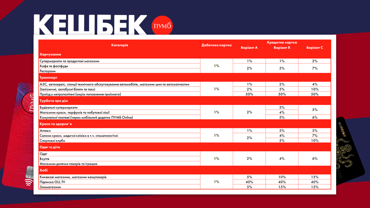 Як і минулого місяця, Банк надає підвищений кешбек за розрахунки кредитною карткою, причому є 3 варіанти відсоткової ставки для кожної категорії.