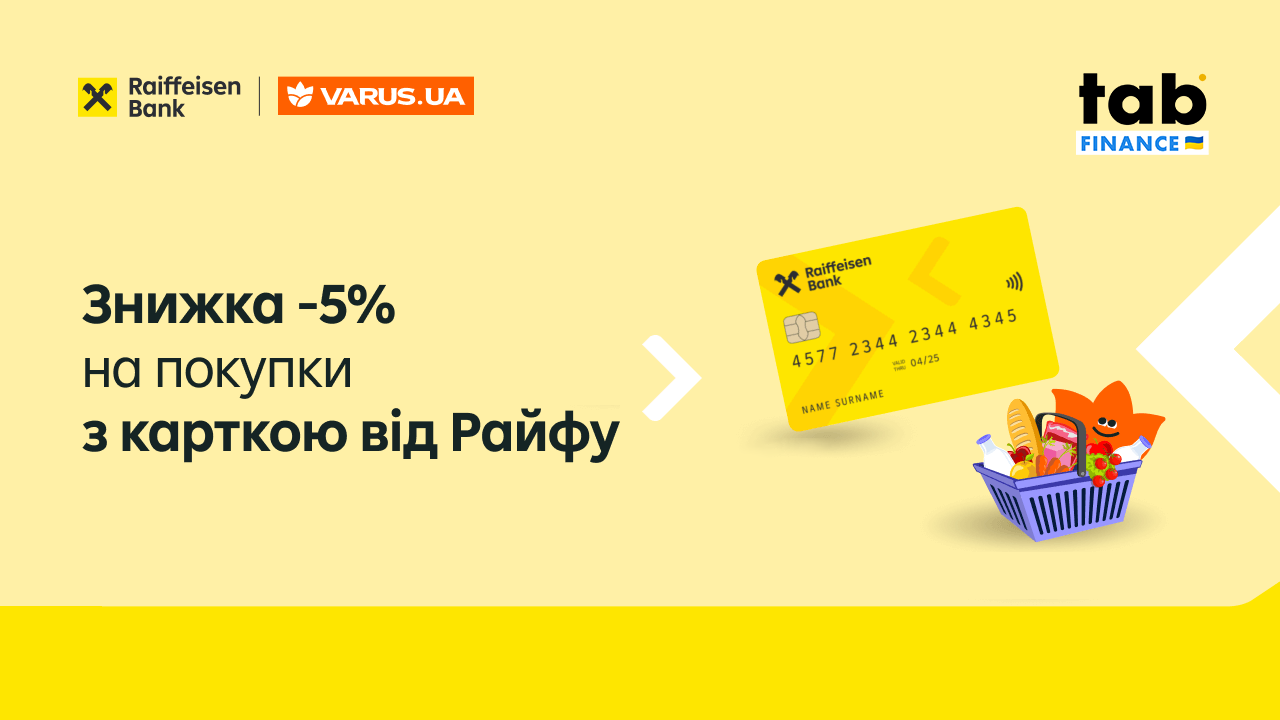 З 28 липня по 31 жовтня розраховуйтеся «Райфкарткою» міжнародної платіжної системи «Visa» в магазинах «Varus» в м. Дніпро та отримуйте 5%-знижку. Знижка не надається на тютюнові вироби, алкогольні напої та подарункові сертифікати.