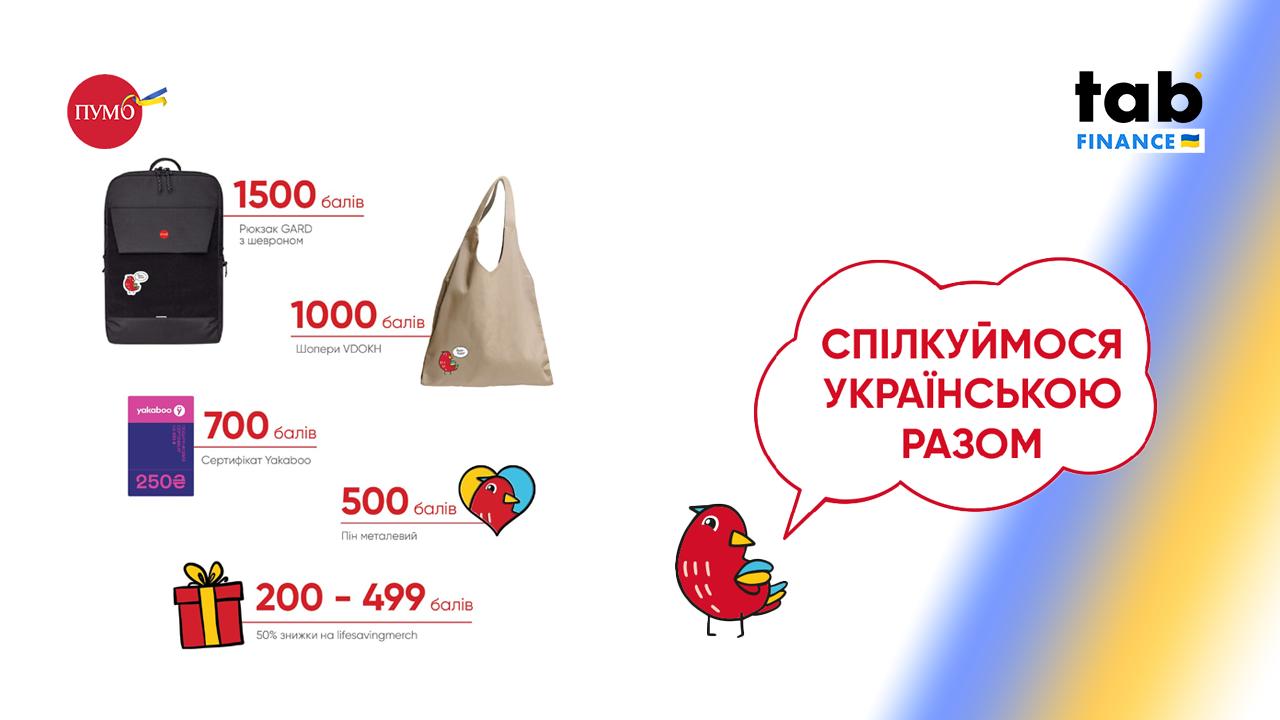 Отримати бали досить просто: відповідайте на запитання про українську мову (100 балів за кожну правильну відповідь), обирайте продукти «ПУМБ» якими Ви користуєтеся (10 балів за кожен продукт), долучайте друзів до ініціативи Банку за реферальним посиланням (10 балів, не більше 100 балів загалом).