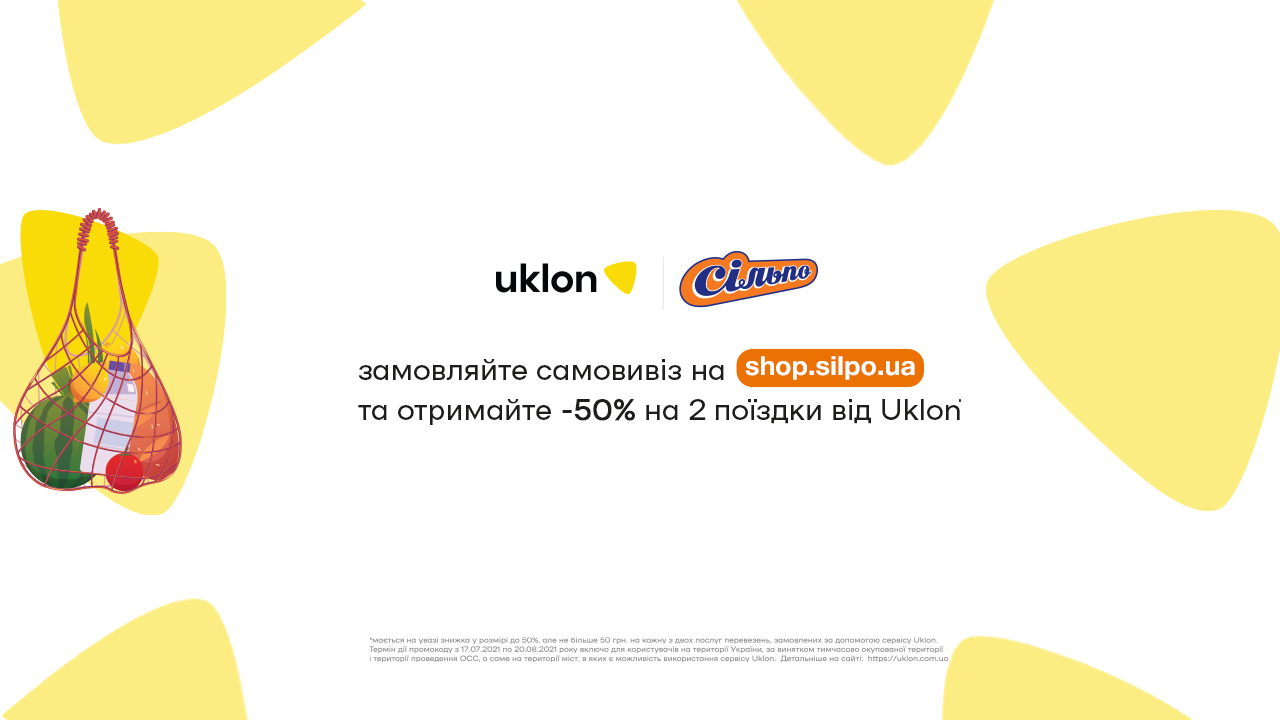 До 20 августа заказывайте вкусняшки в интернет-магазине «Сільпо» с самовывозом на любую сумму и получайте 50%-скидку на 2 поездки с «Uklon»!