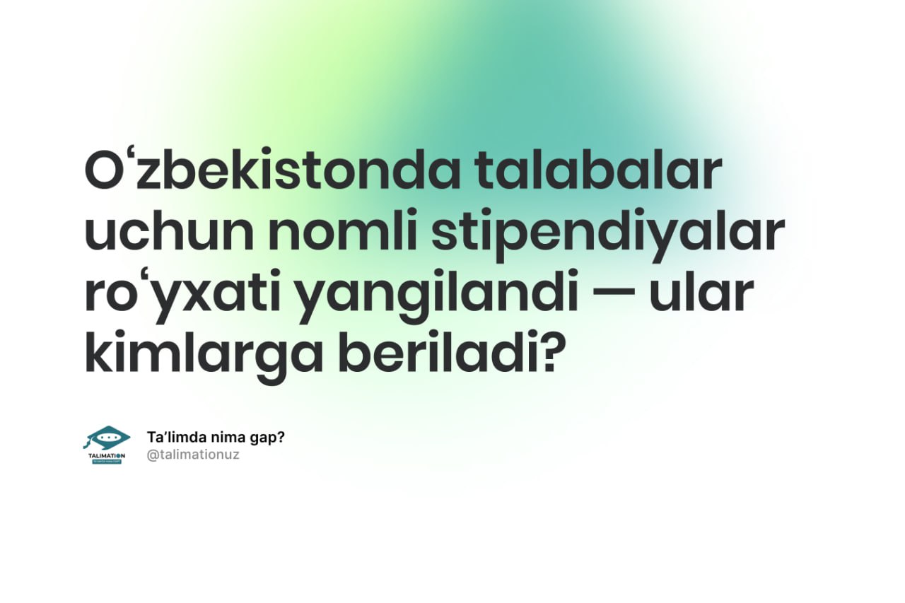Hujjatga ko‘ra, barcha fanlardan o‘zlashtirish ko‘rsatkichlari “a’lo” (ko‘pi bilan 25 foizi “yaxshi”) bo‘lgan hamda ijodiy ishda qatnashadigan bakalavriat ta’lim yo‘nalishida o‘qiyotgan oxirgi ikki kurs talabalari uchun nomli davlat stipendiyalar ta’sis etildi.