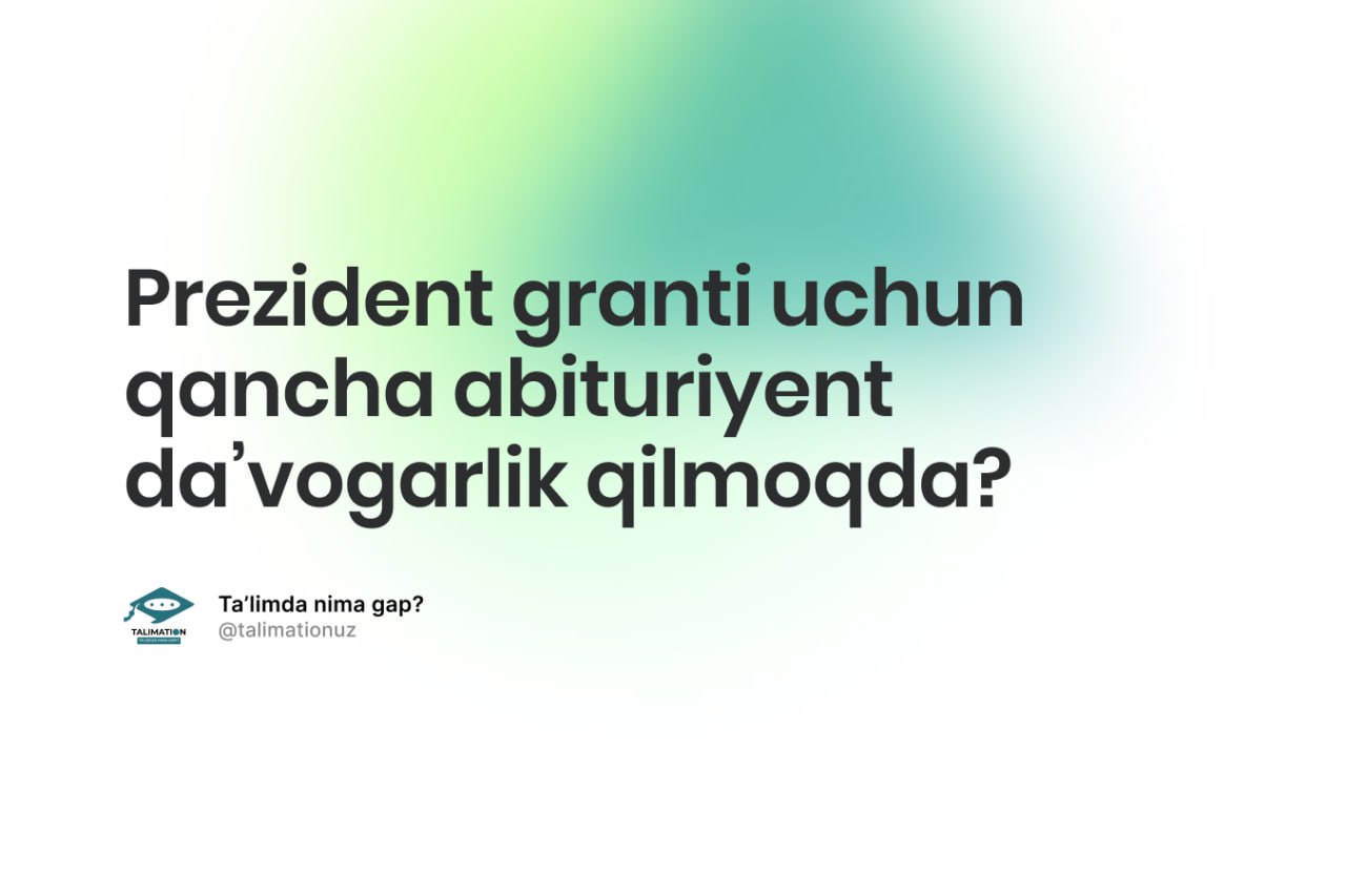 O‘zbekistonda bu yil 302 nafar abituriyent Prezident granti uchun da’vogarlik qiladi. Bu yil o‘tish balli 186.8 ballni tashkil qildi.
