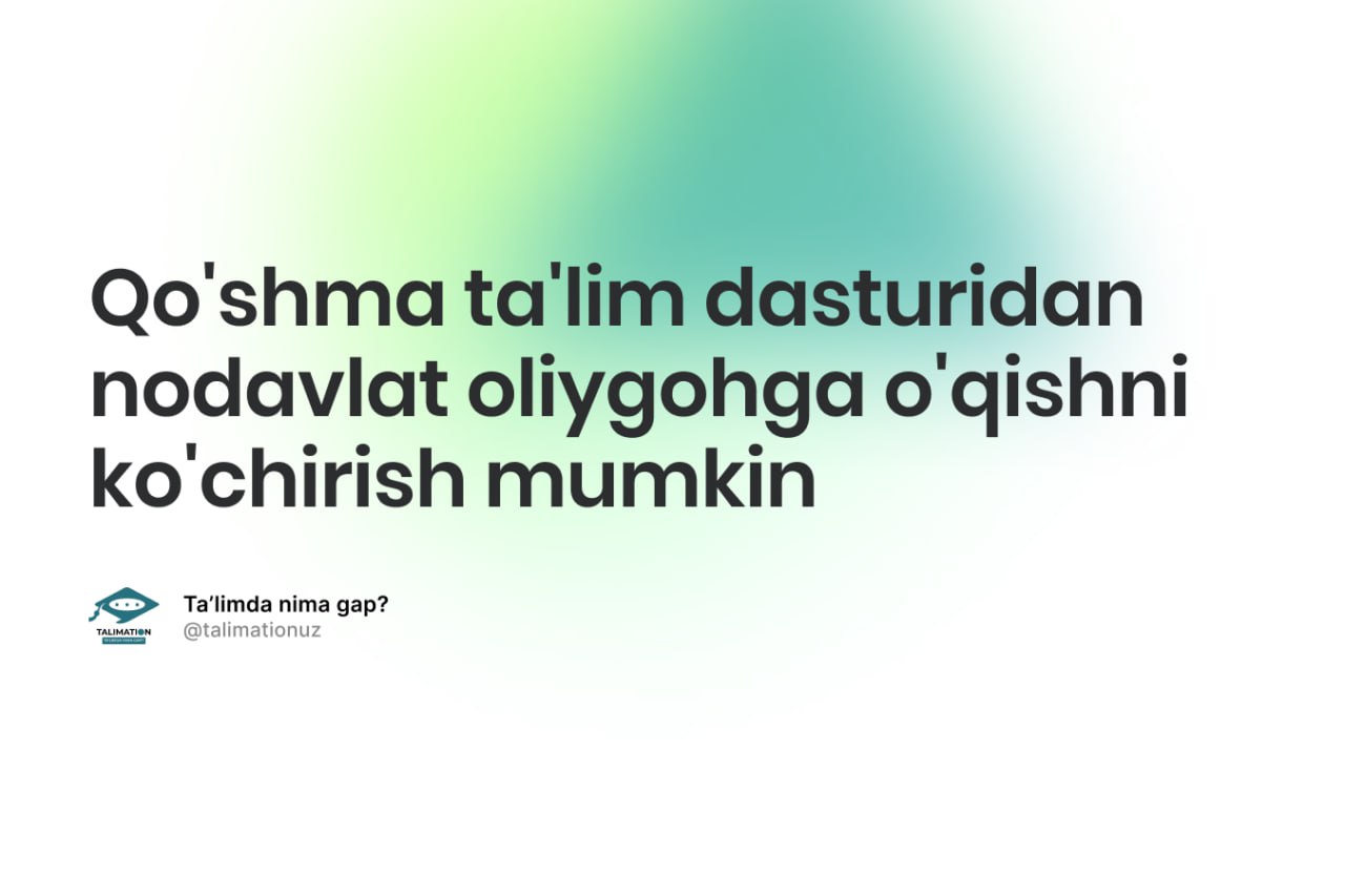Qo'shma ta'lim dasturlarida tahsil olayotgan talabalar o'qishini nodavlat oliygohlariga ko'chirishi mumkin. Bu bo'yicha cheklov yo'q, quyidagi qarorda ham faqatgina davlat oliygohiga ko'chirish mumkin emasligi keltirilgan.
