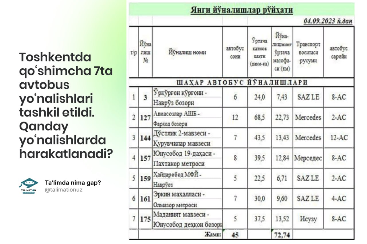 Yo‘lovchilardan kelib tushgan murojaatlar asosida, 4-sentabrdan poytaxtda qo‘shimcha 7ta yangi avtobus yo‘nalishlari tashkil etilmoqda hamda ular quyidagi yo‘nalishlarda harakatlanadi: