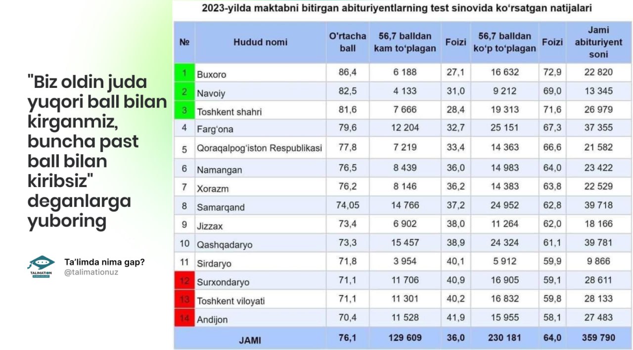 Bu yil kirish imtihonlarida kirish ballarining o‘ta pastligi jamoatchilikni xavotirga qo‘ydi. "Biz 187 bilan talaba bo‘lolmaganmiz, biz boshqacha o‘qirdik..." mazmunidagi gaplar urchidi.