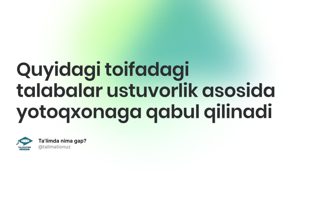 Vazirlar Mahkamasining tegishli qarori (14.08.2023-yildagi 376-son)ga ko‘ra, quyidagi toifadagi talabalar ustuvorlik asosida talabalar turar joylariga qabul qilinadi: