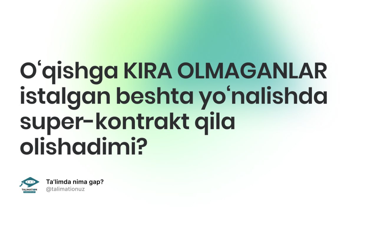 O‘tgan yili beshala yo‘nalishiga ham o‘qishga kira olmagan abituriyentlar istalgan beshta yo‘nalishdan birini tanlab, super-kontraktda o‘qishiga ruxsat berilgan edi.