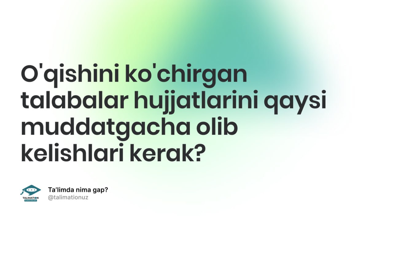 O'qishi ko'chirishga tavsiya etilgan talabalar aloqa xatini olganidan so'ng o'qishini ko'chirgan oliygoh tomonidan belgilangan muddatga qadar aloqa xatida ko'rsatilgan kerakli hujjatlarini olib kelishi shart.
