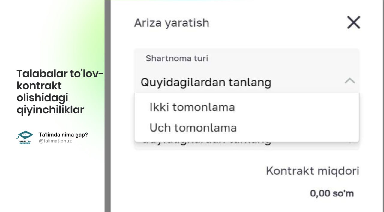 Talabalar to'lov-kontrakt olish maqsadida kontrakt.edu.uz sayti orqali onlayn ariza berayotganda "Shartnoma turini tanlash" degan band bor. Bunda yoki 2 tomonlama, yoki 3 tomonlama shartnomani tanlash so‘ralmoqda. Shu bo‘yicha izoh so‘rab, abituriyentlardan ko‘plab savollar kelib tushdi.
