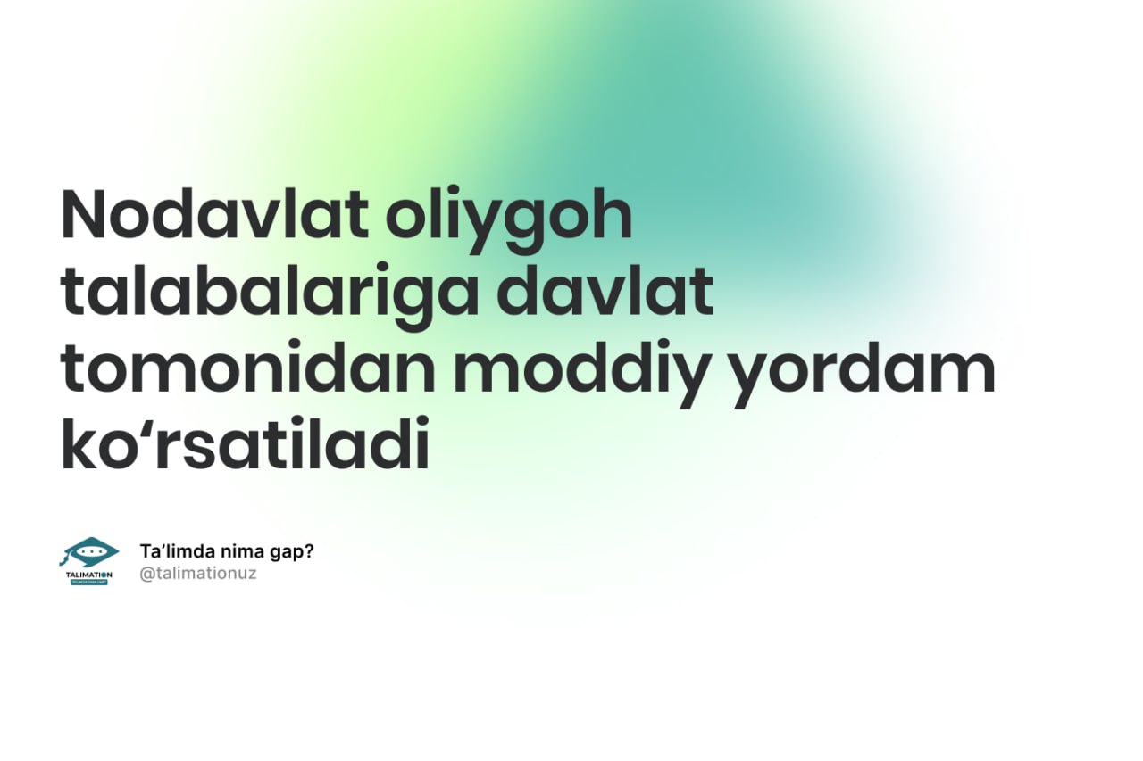 Hukumat qarori (№181 02.05.2023) bilan nodavlat oliy taʼlim tashkilotlarida tahsil olayotgan yetim va ota-onasining yoki boshqa qonuniy vakillarining qaramogʻidan mahrum boʻlgan talabalarga oziq-ovqat, kiyim-kechak va sanitariya vositalarini xarid qilish xarajatlarini moliyalashtirish tartibi toʻgʻrisidagi NIZOM tasdiqlandi.