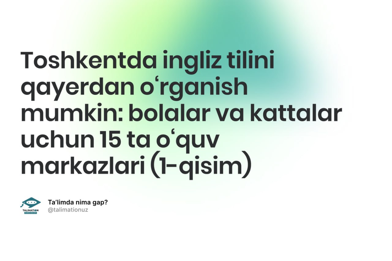 Ta'limda nima gap? pinned «🇬🇧 Toshkentda ingliz tilini qayerdan o‘rganish mumkin: bolalar va kattalar uchun 15 ta o‘quv markazlari (1-qisim) ➡️ Alpha Academy — Darslar rus va oʻzbek tillarida (asosan ingliz tilida) olib boriladi. Bolalar alohida yoki guruh bo'lib o'qishlari mumkin.…»
