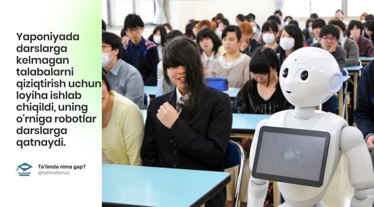 Yaponiyaning Kumamoto shahrida darsga kelmagan o‘quvchilarni qiziqtirish uchun ularning o‘rniga robotlar darsda qatnashishi loyihasi ishlab chiqildi.