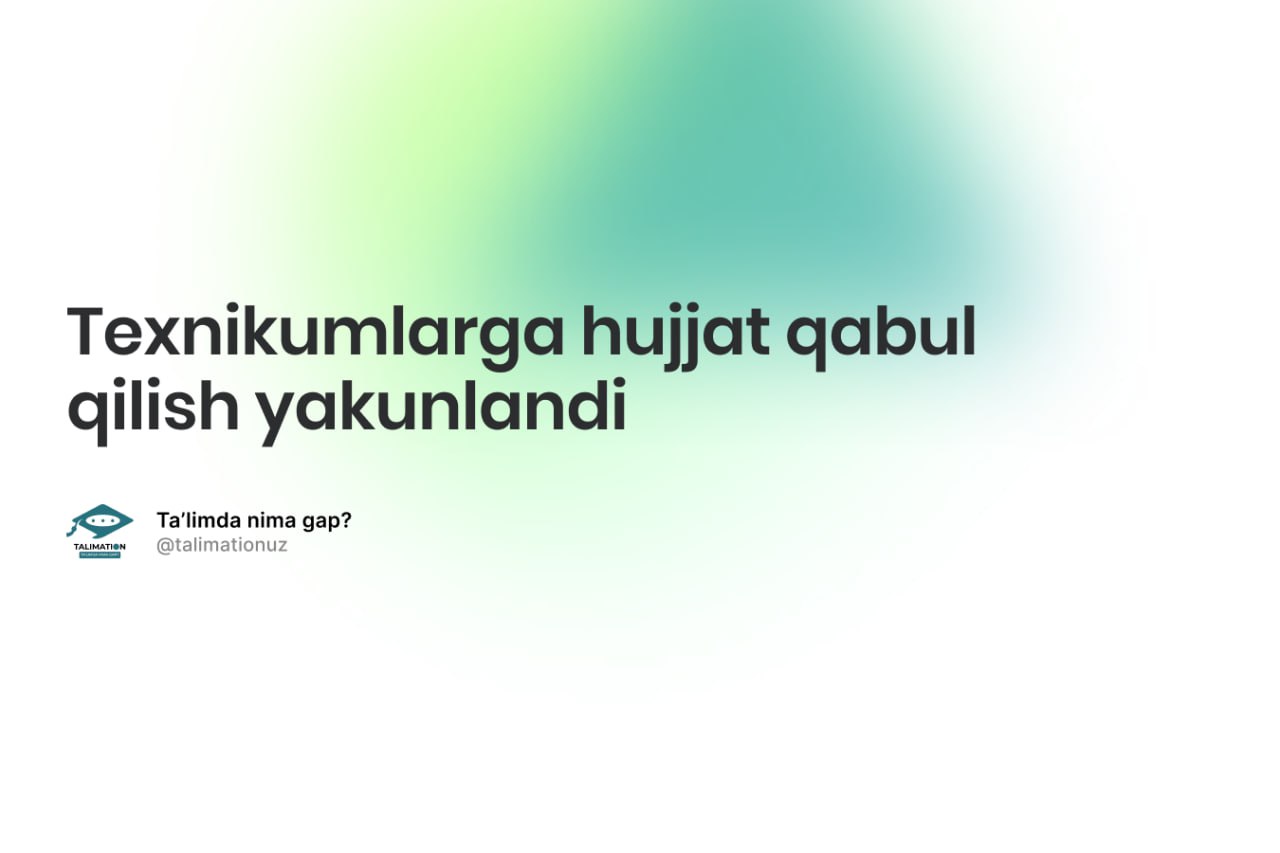10-sentabr kuni texnikumlarga hujjat topshirish yakunlandi. Yakuniy natijaga ko‘ra, my.uzbmb.uz elektron platformasi orqali jami 140 764 nafar abituriyent onlayn ro‘yxatdan o‘tdi.