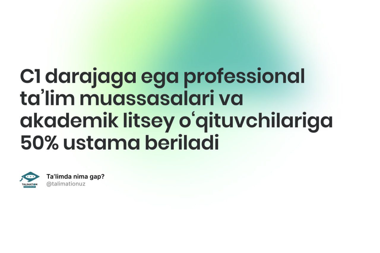 Unga koʻra joriy yil 1-sentabrdan boshlab professional taʼlim muassasalar (kasb-hunar maktabi, kollej va texnikum) va akademik litseyning xalqaro tan olingan va milliy baholash tizimida berilgan kamida С1 darajadagi sertifikatlarga ega umumtaʼlim fan oʻqituvchilari bazaviy tarif stavkasiga nisbatan har oylik 50 foiz miqdorda ustama haq toʻlash yoʻlga qoʻyiladi.