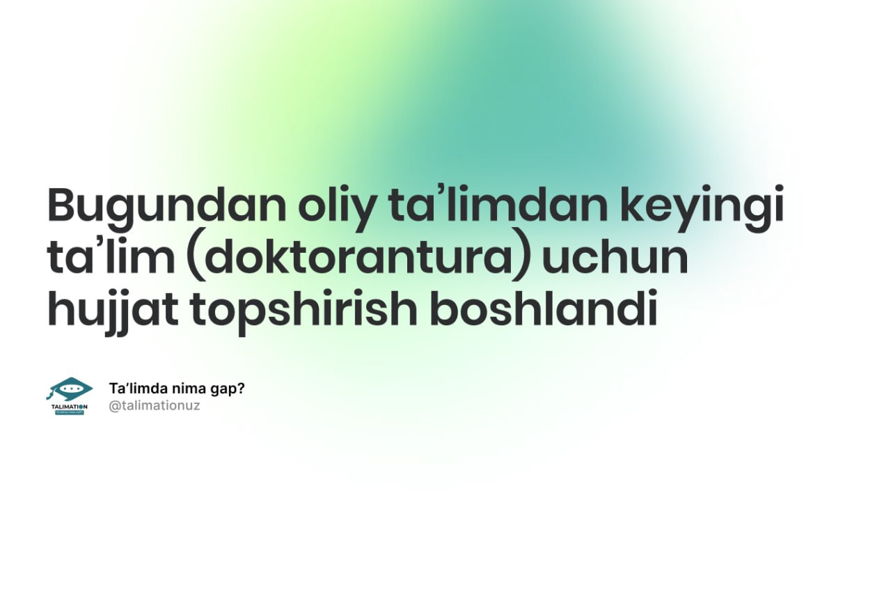 2024-yil 1-chorak uchun oliy taʼlimdan keyingi taʼlimning barcha shakllari bo‘yicha hujjatlar joriy yil 15-sentabridan 15-oktabriga qadar Yagona elektron tizimi orqali qabul qilinadi.