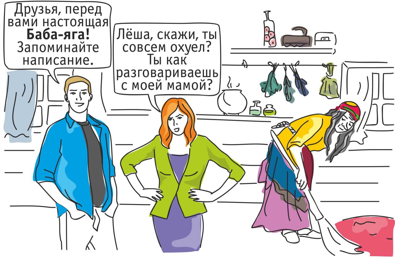 Дальше. Если перед нами имя собственное (говорим о злой ведьме из сказки), тогда пишем с прописной буквы, вот так — Баба-яга. Если же пытаемся обозвать какую-нибудь женщину, то просто называем её бабой-ягой, а большую букву при этом не ставим.