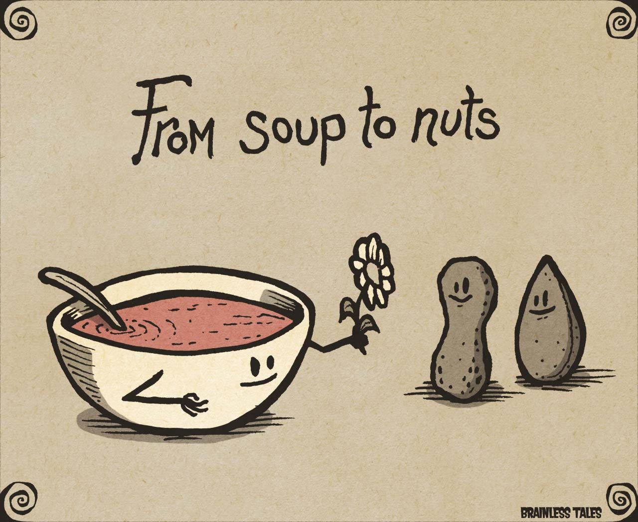 Означает "от начала до конца", а выросла из описания полного обеда, где смена блюд движется от супа к ореховому десерту.