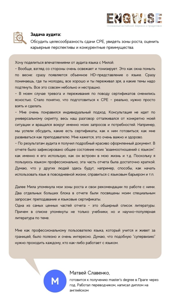 Виктория пришла на аудит, ожидая от нашей встречи оценки уровня английского и понимания своих слабых сторон. Хотелось получить рецепт лекарства “от напряжения в отношениях с английским”. К сожалению, готового лекарства нет, да и — английский это не болезнь. Чтобы понять, откуда неприятные симптомы, стоит разобраться с условиями, в которых вы сталкиваетесь с языком. Безусловно, важно понимать, на каком этапе развития языковых компетенций находится изучающий, но основное внимание стоит уделить уточнению языковых целей, присутствию языка в жизни и процессу его изучения. Я задумала Reality-check не как тестирование, а как исследование для самостоятельного решения ваших актуальных языковых задач.