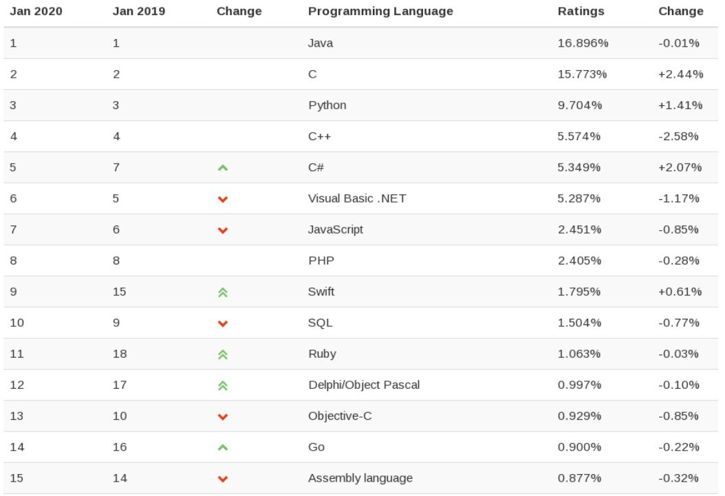 Вышел первый в 2020 году рейтинг языков программирования TIOBE. Лидеры уже который месяц неизменны — это Java (1-е место), за ним Си, Python и C++. Языком 2019 года стал, как ни странно, не Python, а Си. У экспертов есть тому логичное объяснение.