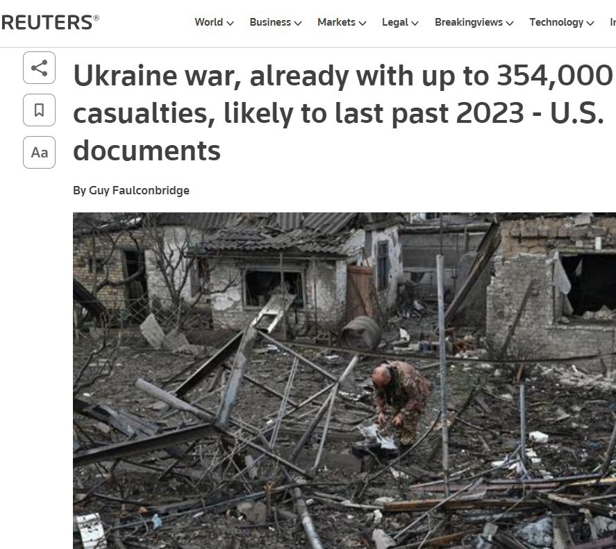 Reuters со ссылкой на другой документ из утечки сообщало, что, по оценке американских военных, Россия потеряла от 189,5 тысячи до 223 тысяч человек, из которых убитыми — 35,5-43 тысячи. Потери Украины назывались в 124,5 тысяч, из которых убитыми 15,5-17,5 тысячи.