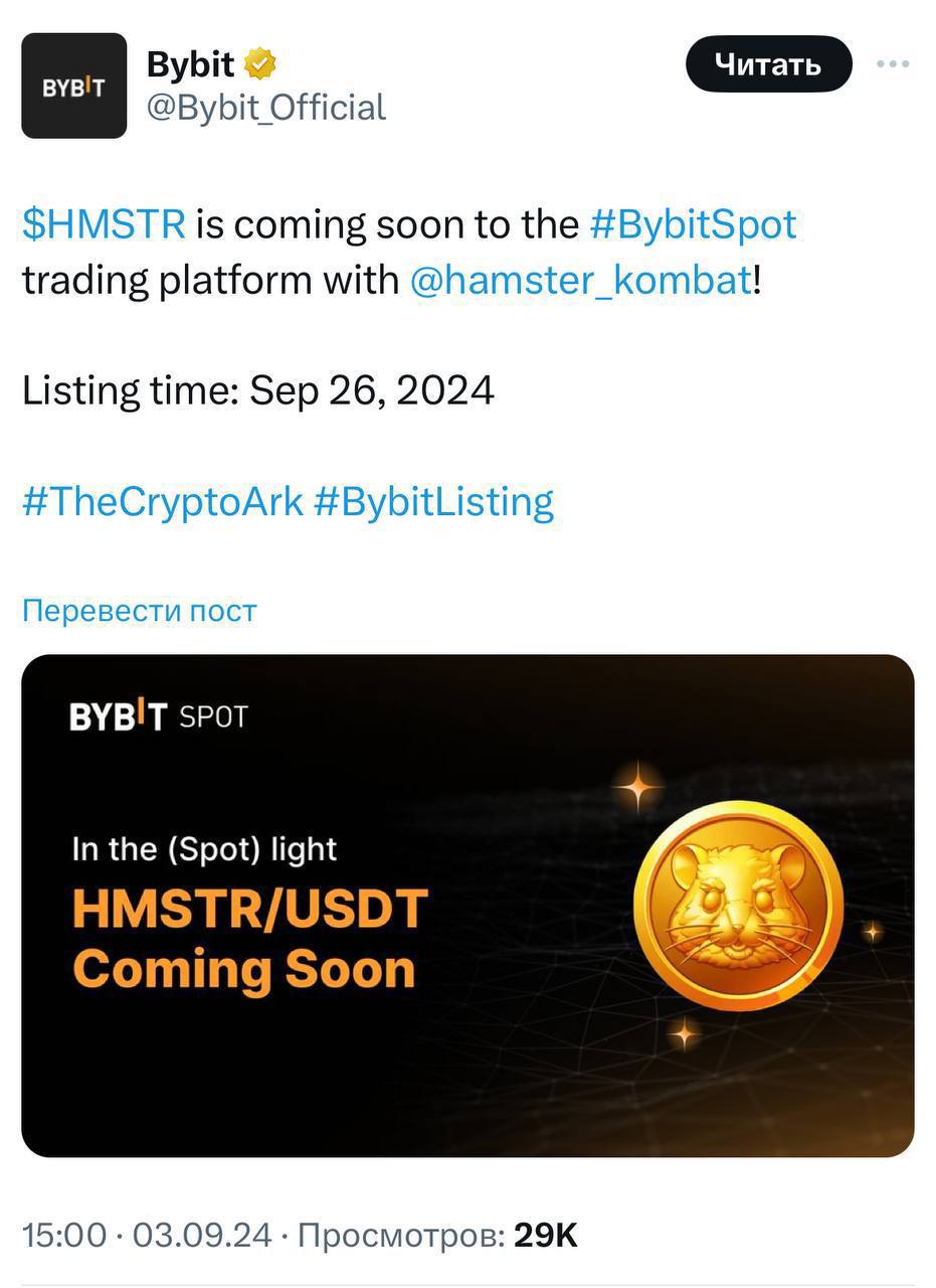 Биржа Bybit объявила о листинге «Хомяка» в один день с OKX — 26 сентября.