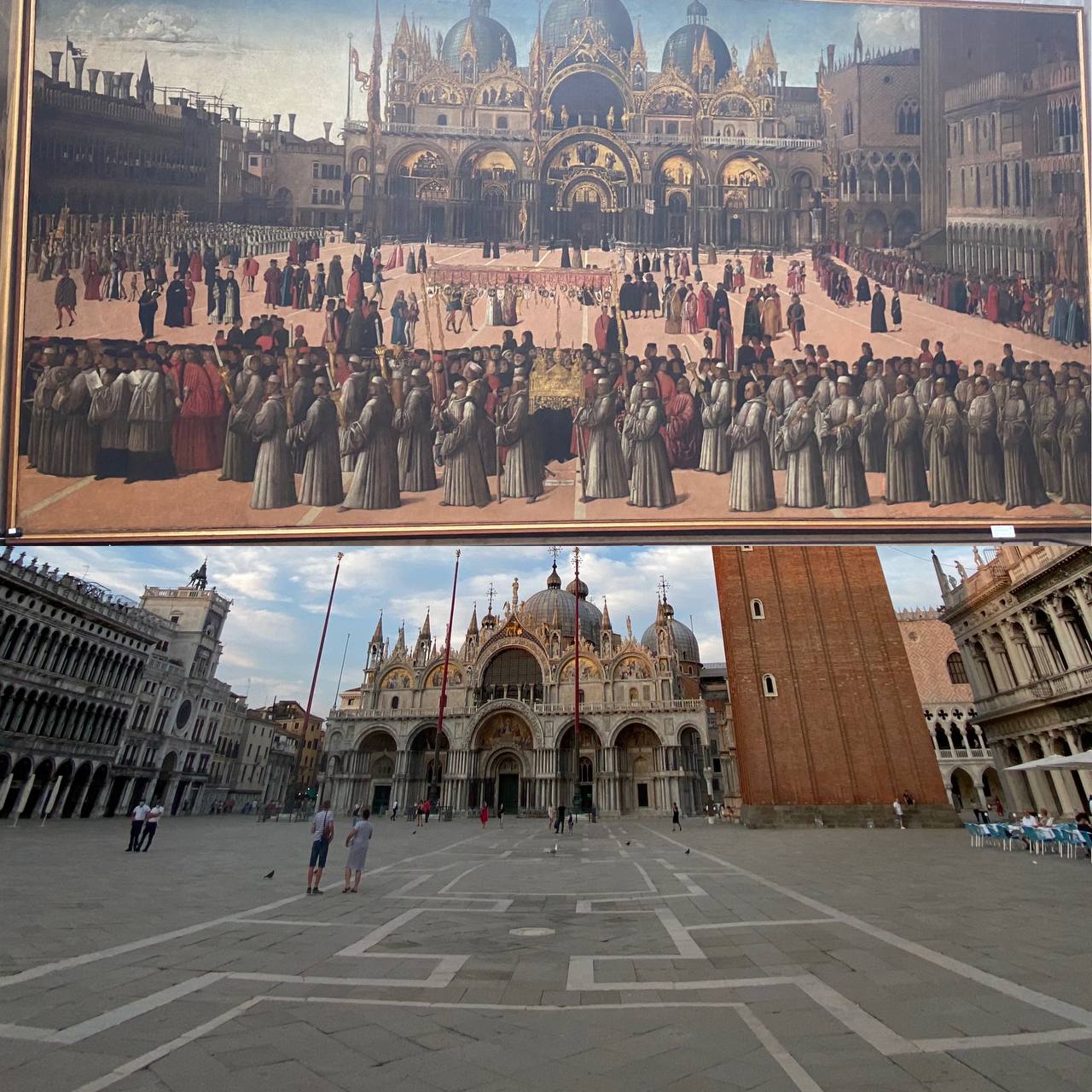 Вернемся к нашим праздным размышлением над концептом государства. Просятся такие аналогии: “существовал” ли Бог до сотворения мира? Очевидно, что нет, поскольку «до» предполагает наличие концепта «времени», который был изобретен при сотворении (внутри него). То же с человеком и языком (культурой). Всё, что «до», пребывает в небытии. Так же и с государством (об этом говорил Бурдье, говоря о том, что субъект, дерзающий размышлять о государстве, — не более чем его же, государства, объект, наличие которого государством санкционировано и даже запрограммировано). В общем, это описание клети по сю сторону ее прутьев. Посмотрим на иллюстрацию ниже. Сверху видим площадь Сан-Марко, вписанную в государственный ритуал, практики осмысленности и упорядоченности. Снизу видим, ту же площадь, выписанную из этого дискурса, даже без туристов. Так город-государство-призрак становится городом-призраком. А был ли город, или это только плод художественного усилия?.