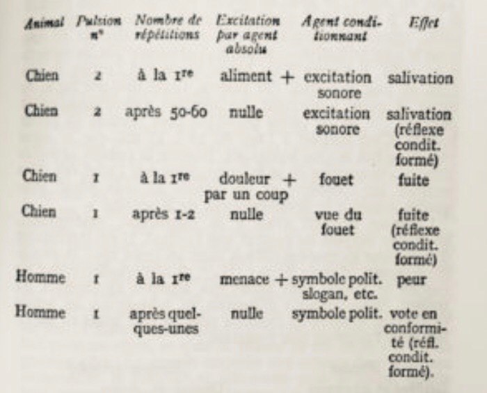 1) Трудящийся, он вроде собаки, выдрессировать его проще простого: есть 4 ключевых импульса-условных рефлекса: 1) рефлекс борьбы (pulsion combative), пищевой рефлекс (la pulsion alimentaire), сексуальный рефлекс (la pulsion sexuelle) и рефлекс родительский (la pulsion parentale). Любая пропаганда построена на апелляции к этим четырем вещам.