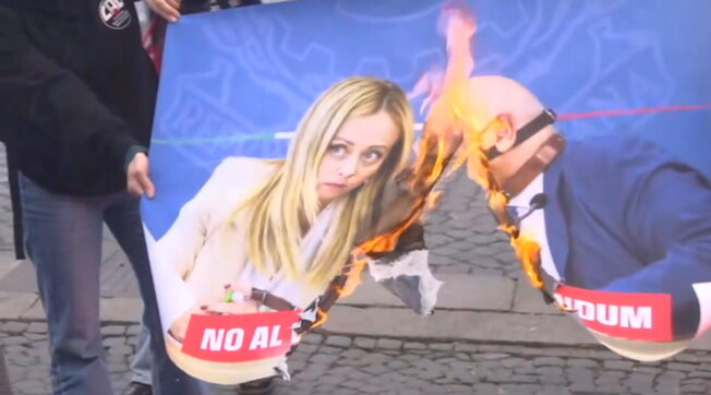 Roma, bruciato cartellone con Meloni e Nordio: "No al vostro referendum" Leggi l'articolo completo su Tgcom24