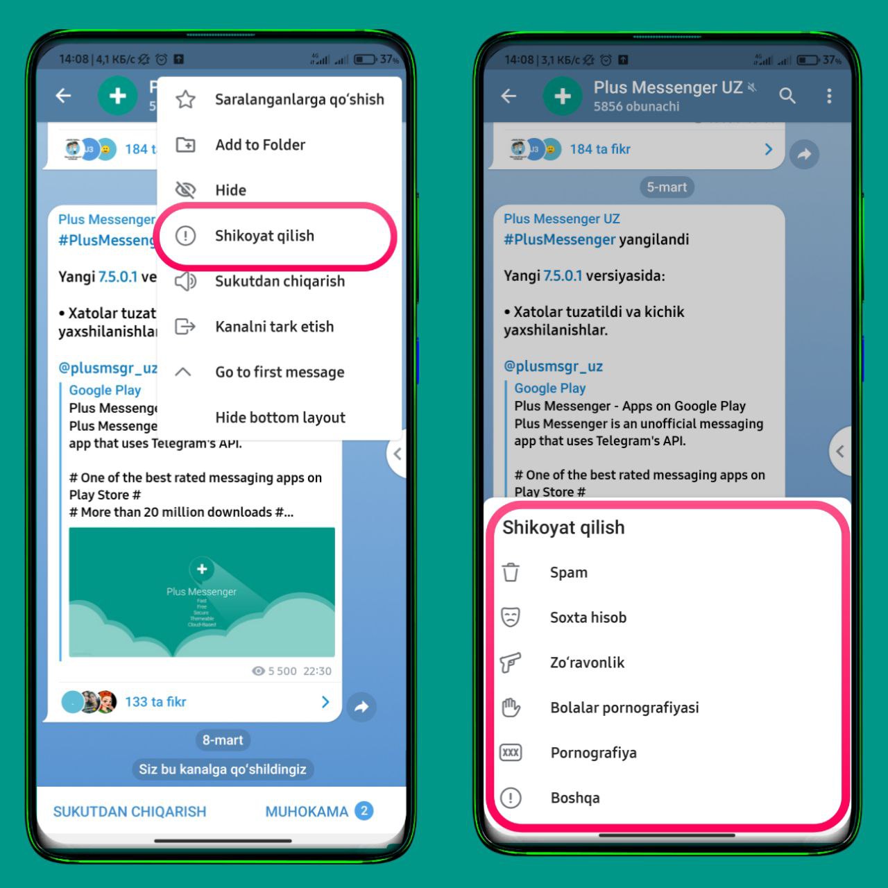 Shikoyat qilish uchun, sizning muallifligingizda bo'lmagan kanal yoki chatda yuqori o'ng burchakdagi 3 vertikal nuqtani bosing va shikoyat qilish bo'limini toping.