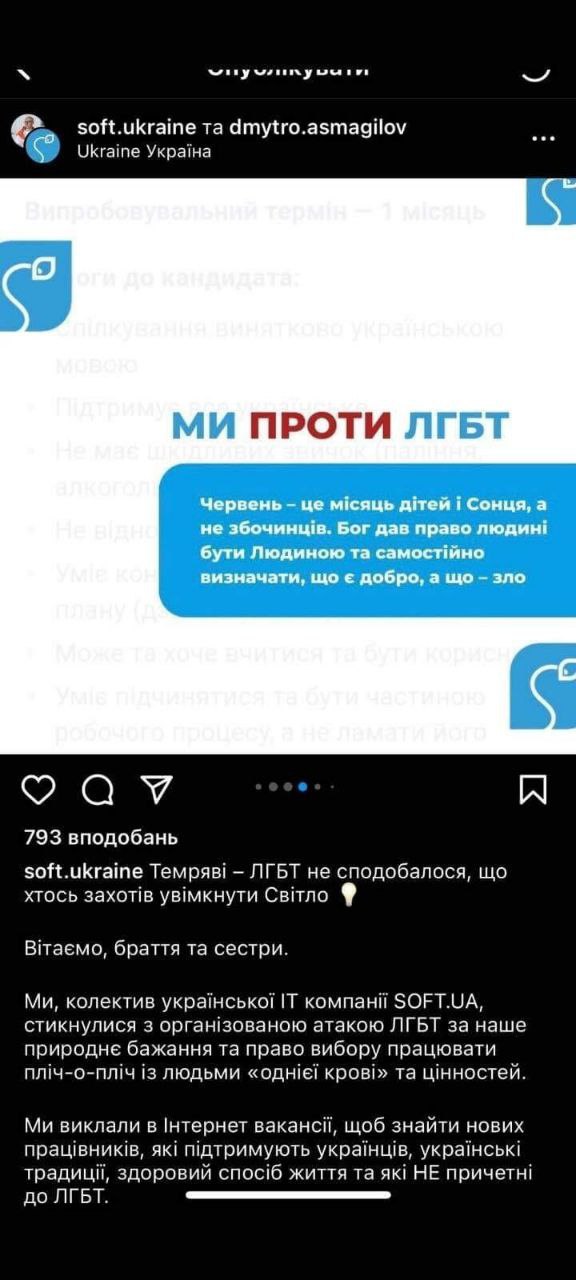 Передісторія: Компаія Soft.ua опублікувала вакансію, де серед вимог було зазначено “не відноситься до ЛГБТ спільноти”. Після суспільного резонансу, цю вимогу прибрали. Але пізніше компанія опублікувала пост, де заявили “Ми проти ЛГБТ” і назвали квір людей “збоченцями”.