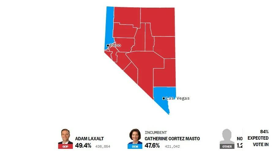 Laxalt is leading in every county except in the Reno and Las Vegas areas where the race is very close.