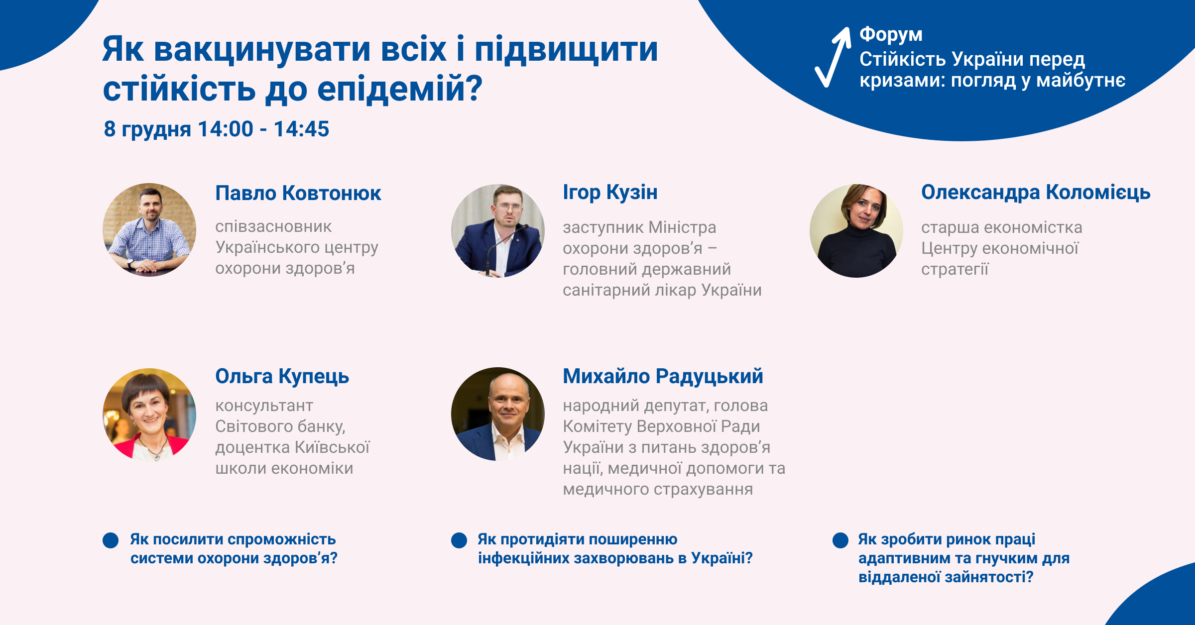 🗣На панельній дискусії о 14:00 експерти, парламентарі та урядовці обговорять, те як протистояти пандемії, скільки коштів на це потрібно та як адаптувати ринок праці під умови дистанційної роботи.