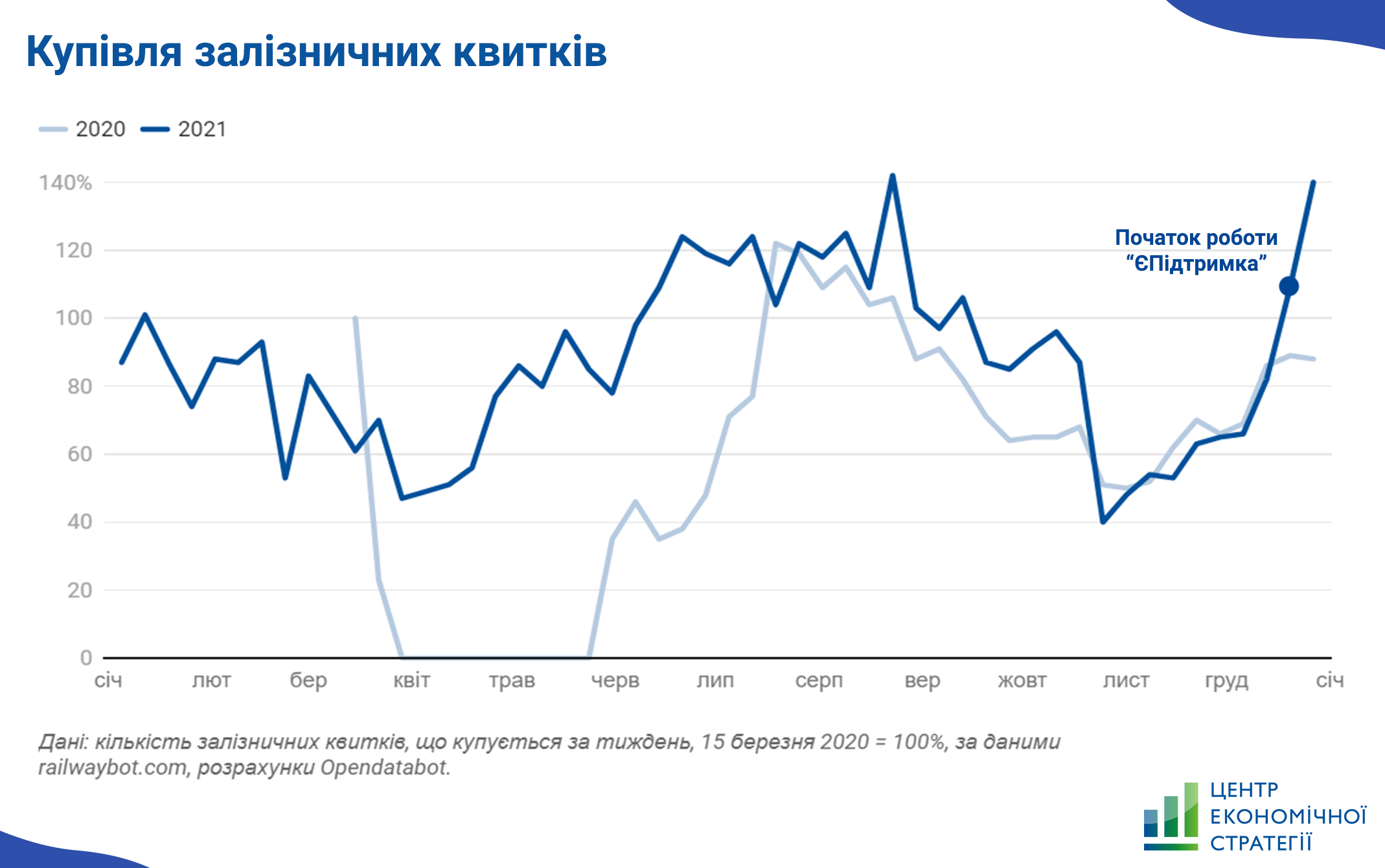 🚆За грудень 2021-го купівля залізничних квитків зросла на 40% — це у 1,5 рази вищий показник, ніж за грудень 2020-го.