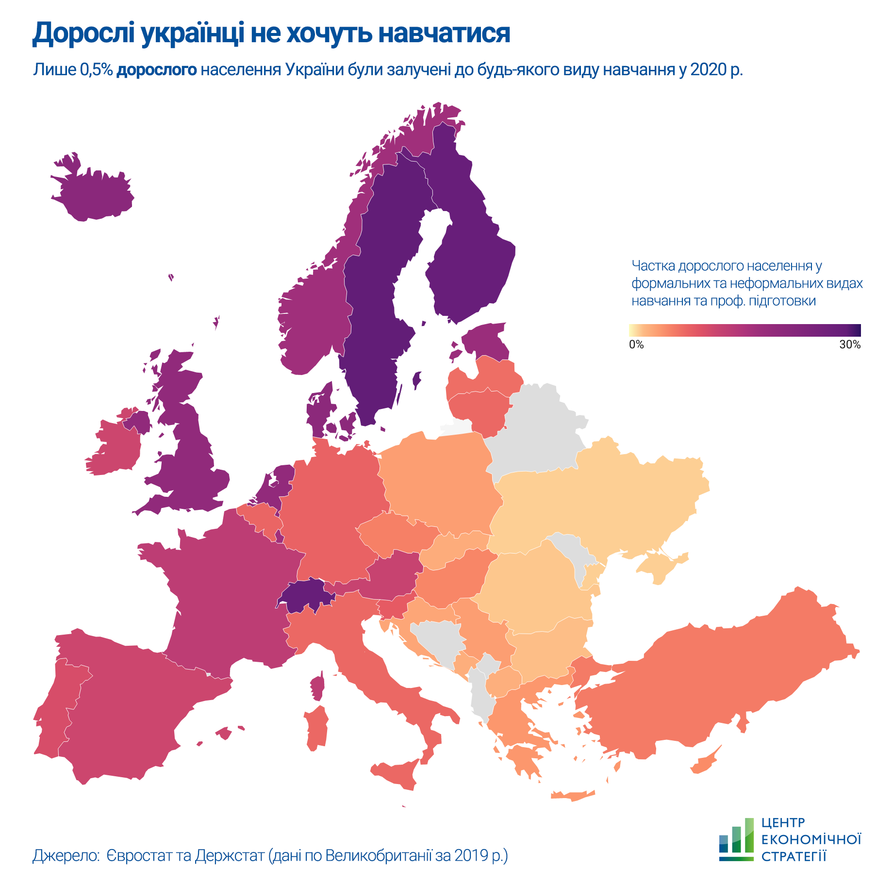 Для порівняння, в середньому по ЄС у цьому ж році навчалося 9,2% дорослого населення, а у скандинавських країнах - понад 20%.