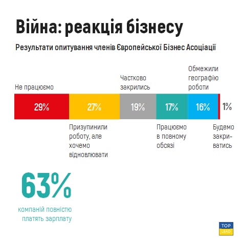 🔗29% українських компаній не працюють, 63% виплачують заробітну плату у повному обсязі