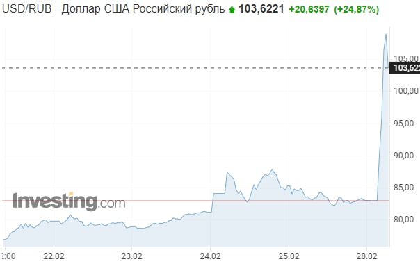 ▪️Рубль може впасти у кілька разів і просідатиме до рекордного рівня стосовно доллару. Адже ЄС та G7 вирішили заморозити резерви РФ, які необхідні для підтримання курсу рубля.