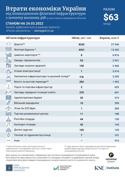 Станом на 17 березня росія пошкодила/зруйнувала/захопила майна на 62,6 мільярда доларів.