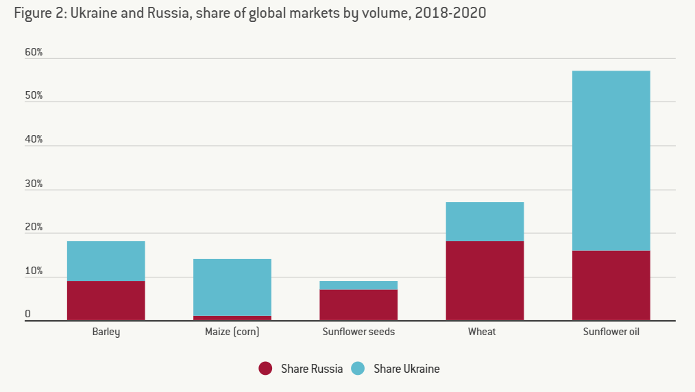 Графік: Bruegel, частка українських та російських продовольчих товарів на світовому ринку