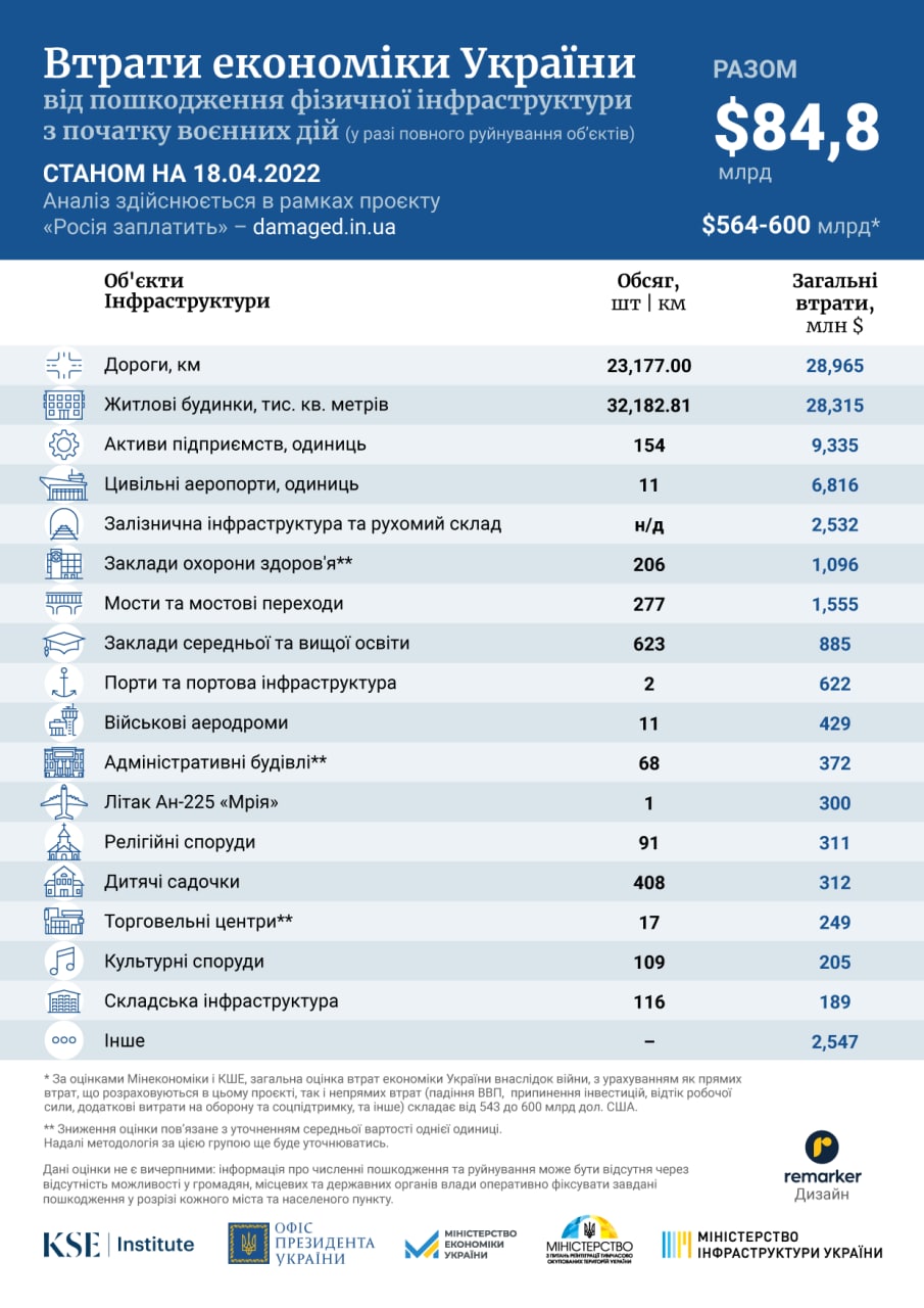 Таким чином загальна прямих задокументованих збитків інфраструктури досягла $84,8 млрд. Збитки обчислюють економісти ЦЕС, спільно з командою KSE Institute та іншими експертами.