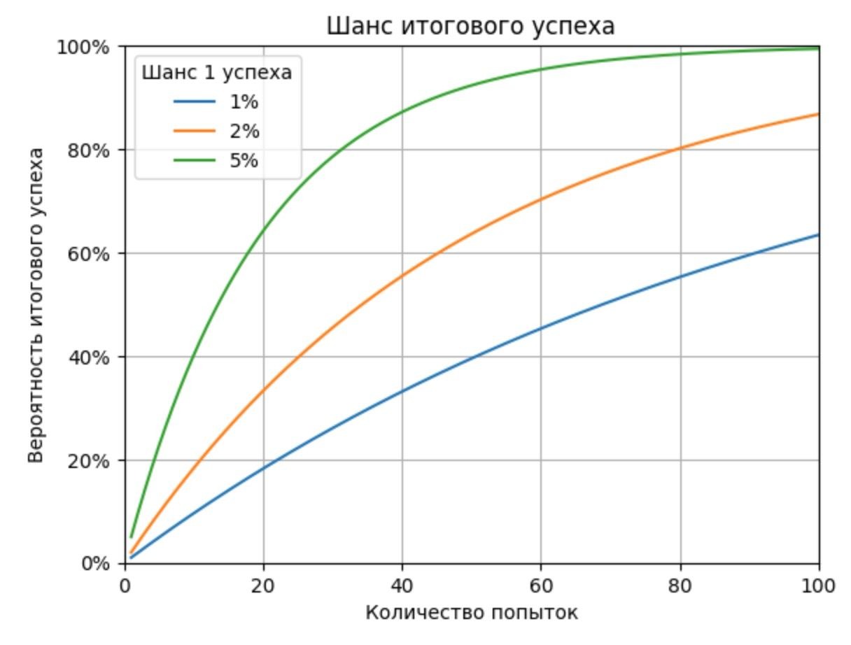 Представим игру под названием "Успех": Вселенная загадывает число от 1 до 100, а Миша пытается его угадать. Если угадывает — Миша стал успешным, иначе нет. Миша может выбрать число наугад, в таком случае действительно шанс выигрыша 1%, а успешность Миши не зависит от его стараний. Но может ли Миша всё таки повысить свои шансы на выигрыш?
