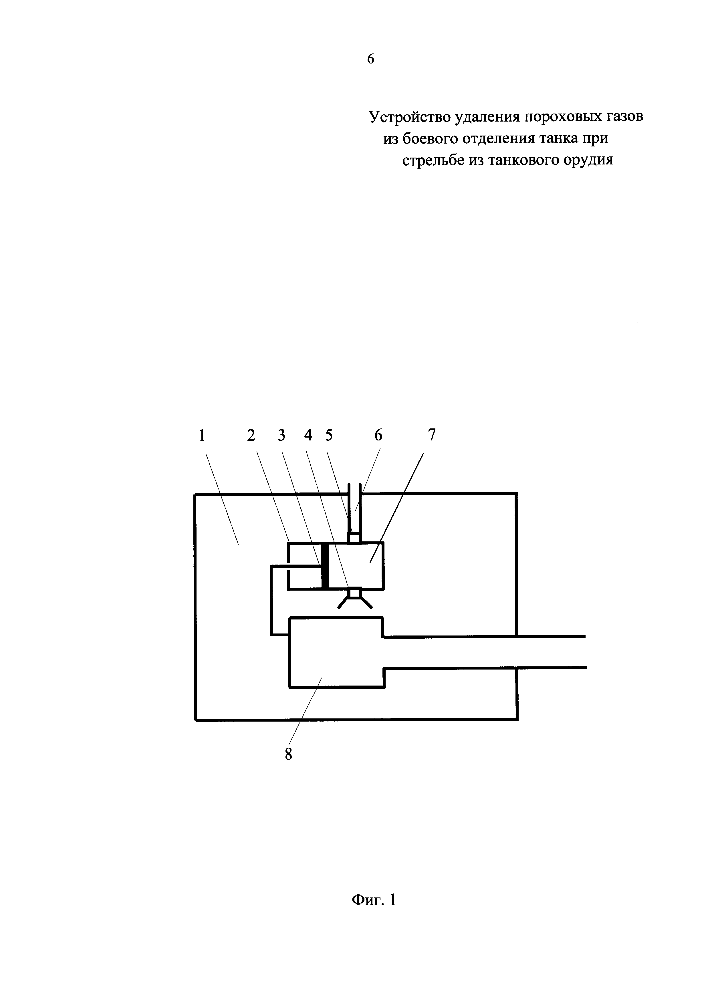 Танк, содержащий боевое отделение, ствол, казённик, характеризующийся тем, что он снабжён устройством удаления пороховых газов из боевого отделения, представляющим собой неподвижный относительно казённика цилиндр, в котором размещён подвижный поршень, жёстко соединённый через шток с казёнником, рабочая полость цилиндра соединена с первым односторонним клапаном и с трубопроводом выпуска пороховых газов, в котором установлен второй односторонний клапан.