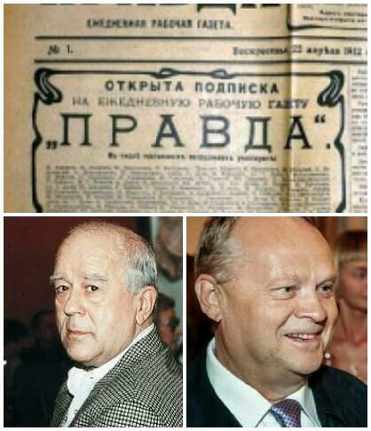 На фото: первый номер "Правды"; апостолы перестройки- Виталий Коротич (главред журнала "Огонёк") и Владислав Стараков (основатель газеты "Аргументы и Факты"). Помните?