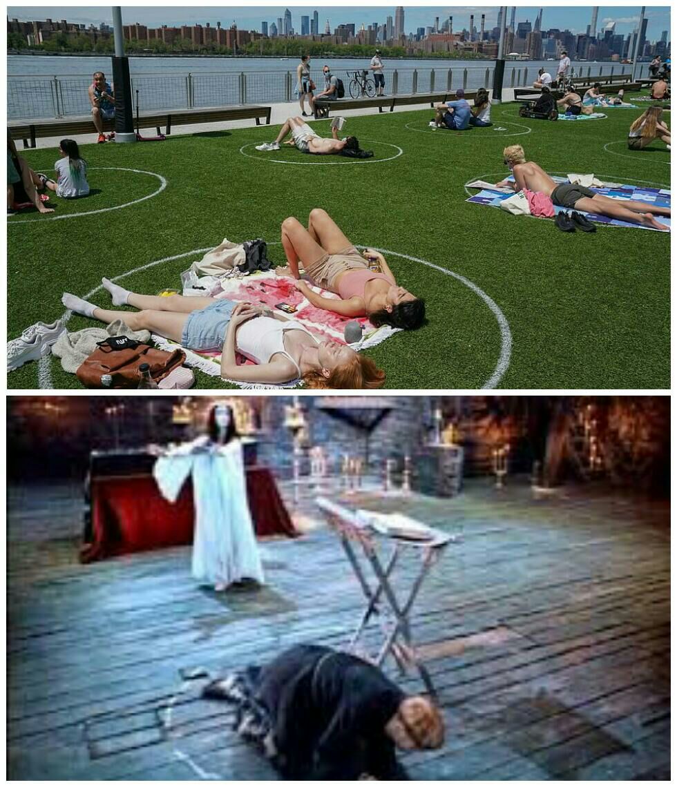 В Нью-Йоркском парке устали бороться с ковидиотами, не соблюдающими предписанныне меры предосторожности и нарисовали для непонятливых "круги изоляции".