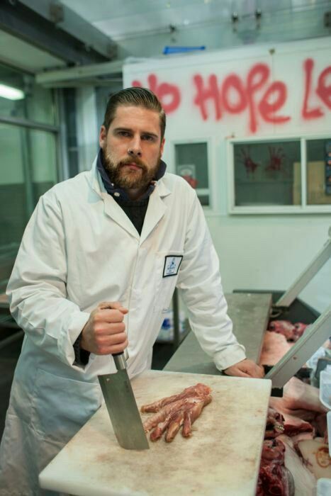 Все это напоминает сцену из фильма ужасов: человеческие конечности, упакованные и представленные на всеобщее обозрение. Мясо, свисающее с крючков, отдельные органы, расположенные на столах, сделанных из нержавеющей стали, как в морге.