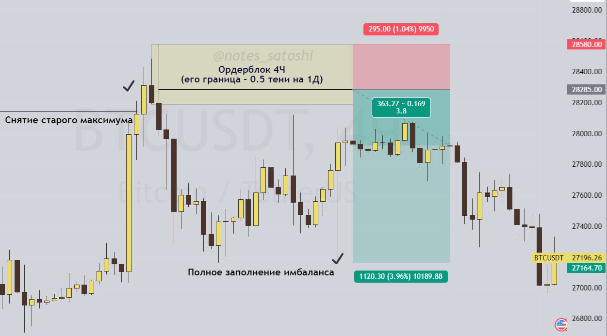 🔵 Наиболее значимые ордерблоки формируются при снятии крупной ликвидности – обновлении круглого уровня без закрепления или же ложной смене тренда. Входить в позицию стоит только при наличии реакции от границы OB (желательно наличие крупного имбаланса у границы) или его 50%; границы ордерблоков с крупных таймфреймов 1Д/3Д/1Н необходимо уточнять по 4ч/1ч.