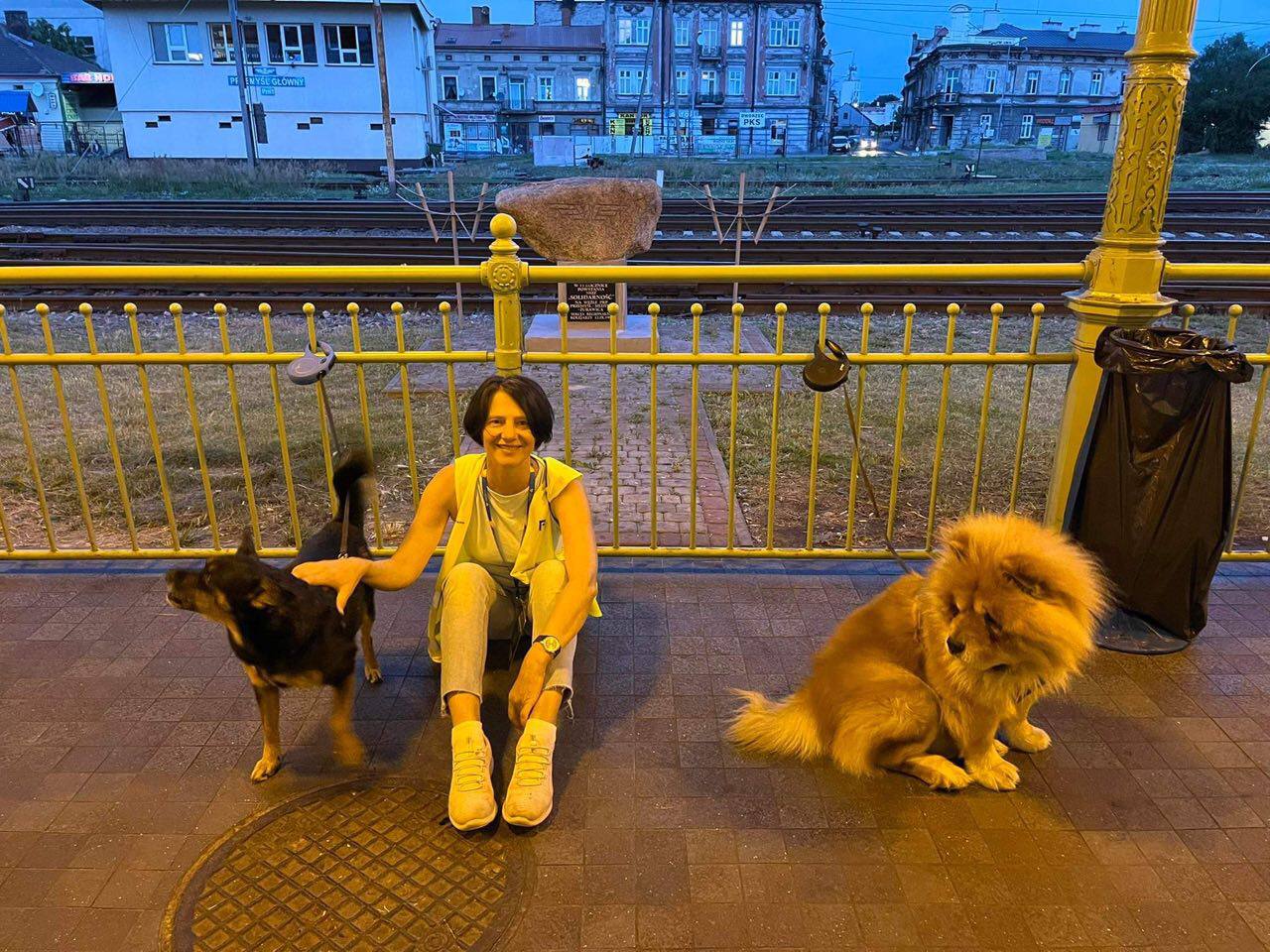 Девушка с двумя собаками едет из Варшавы обратно в Киев.