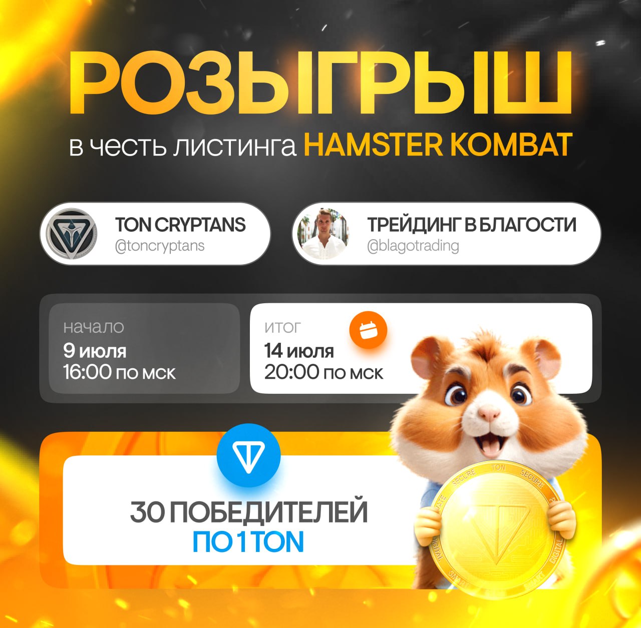 Друзья. В честь листинга крупнейшего крипто-проекта HAMSTER COMBAT (200 000 000 + пользователей). Дружественные каналы Ton Cryptans и Трейдинг в благости разыгрывают среди 30 счастливчиков ценные призы в размере 1 TON.